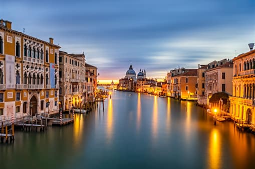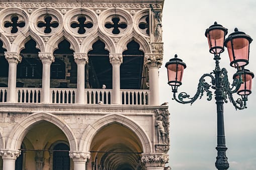 A car-free city of islands linked by bridges and famed for its Gothic and Byzantine architecture, facing challenges like flooding and overtourism.
